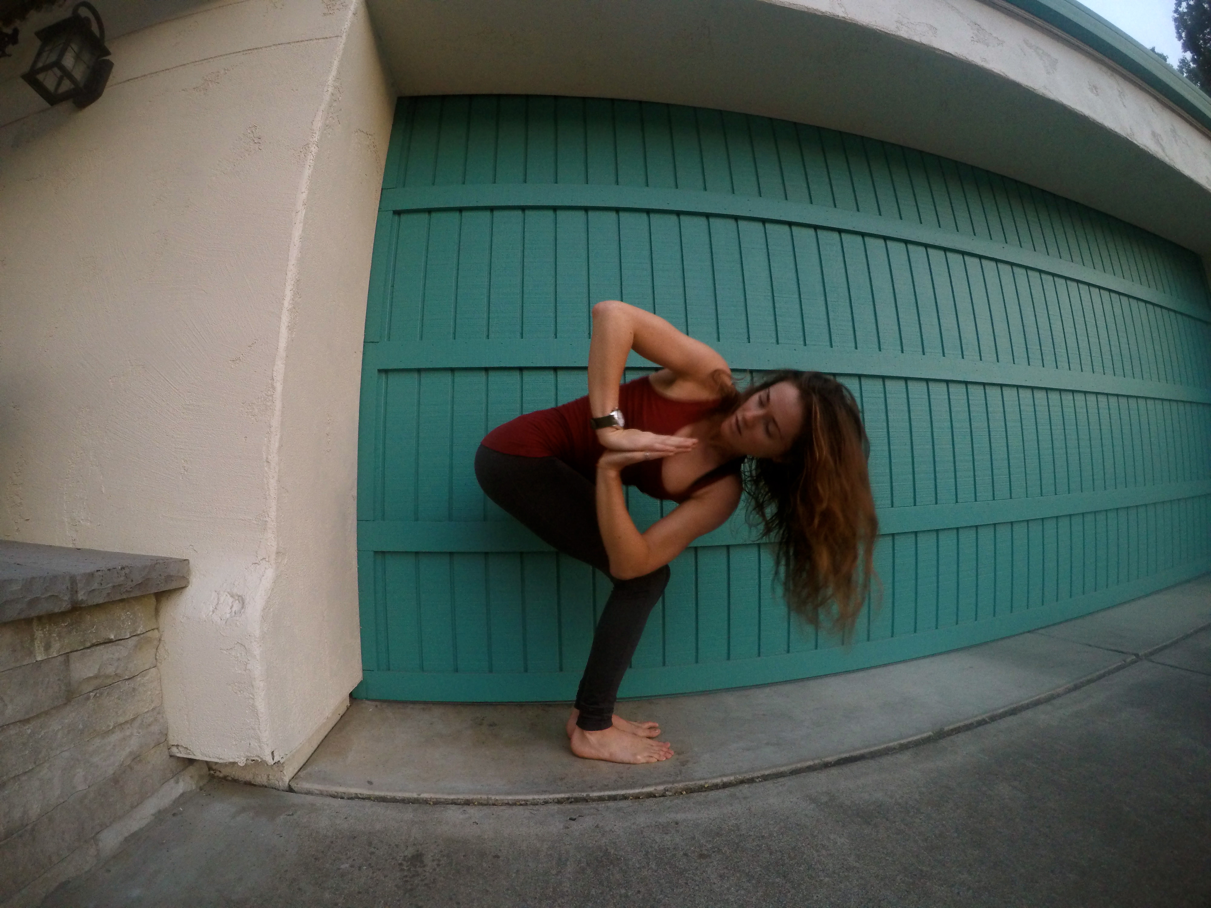9. Chair – Hands heart center – Twist – Opposite foot back