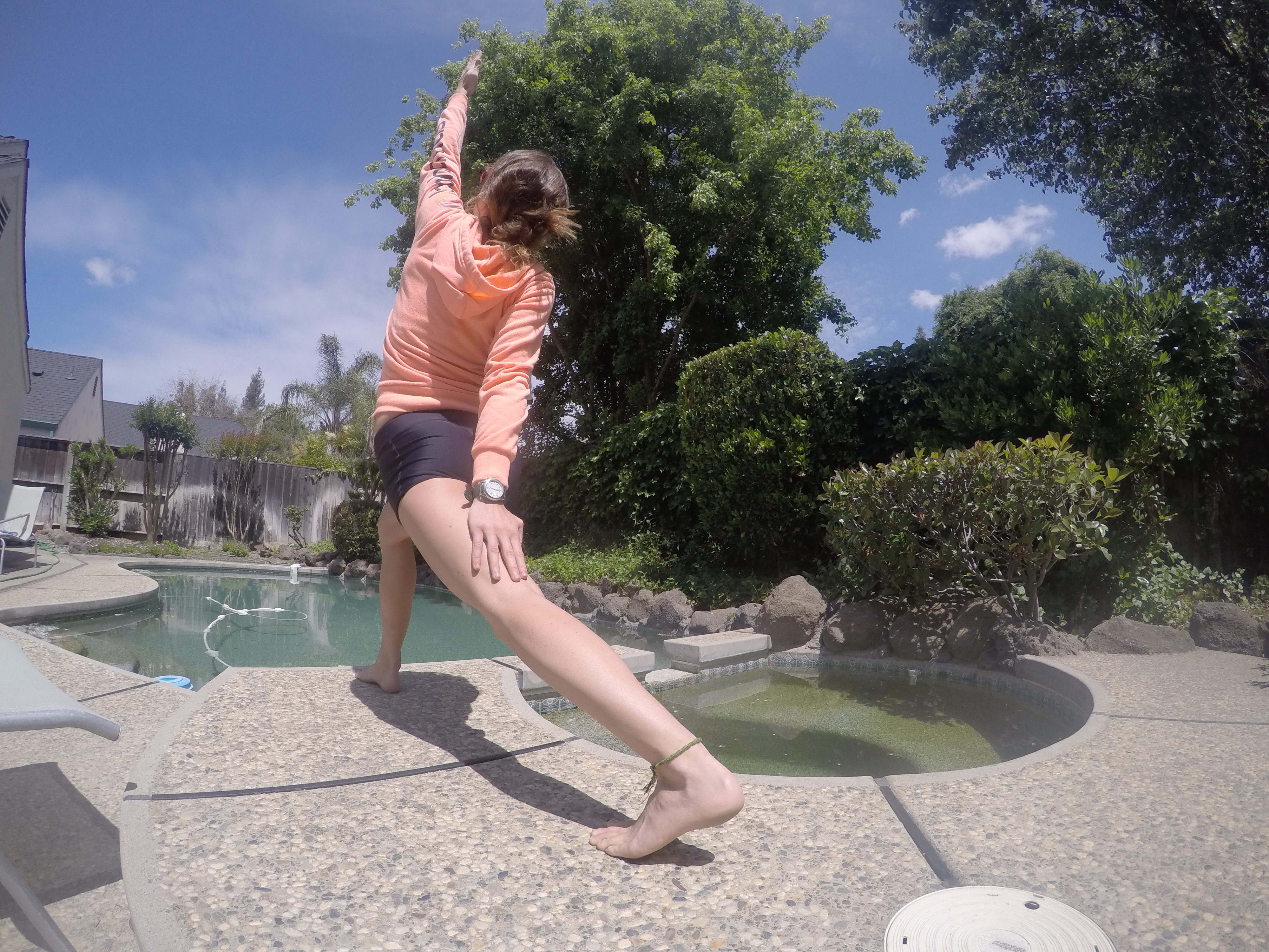 24. From crescent lunge straighten the front leg and bring back leg to tippy toes. Hinge at the hips, bend over front leg stretching hips toward the sky. If available hover front foot off the ground.